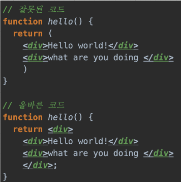 JSX를 사용하면서 지켜줘야할 규칙들이 많다. 처음으로는 JSX는 컴포넌트에 여러 엘리먼크 요소가 있다면 반드시 부모 요소 하나로 감싸줘야 한다.