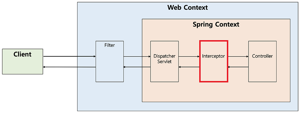 Interceptor(인터셉터)는 Spring Context에서 제공하는 기능으로, DispatcherServlet 이후 Controller로 요청이 전달되기 전/후에 특정 로직을 실행할 수 있습니다.
