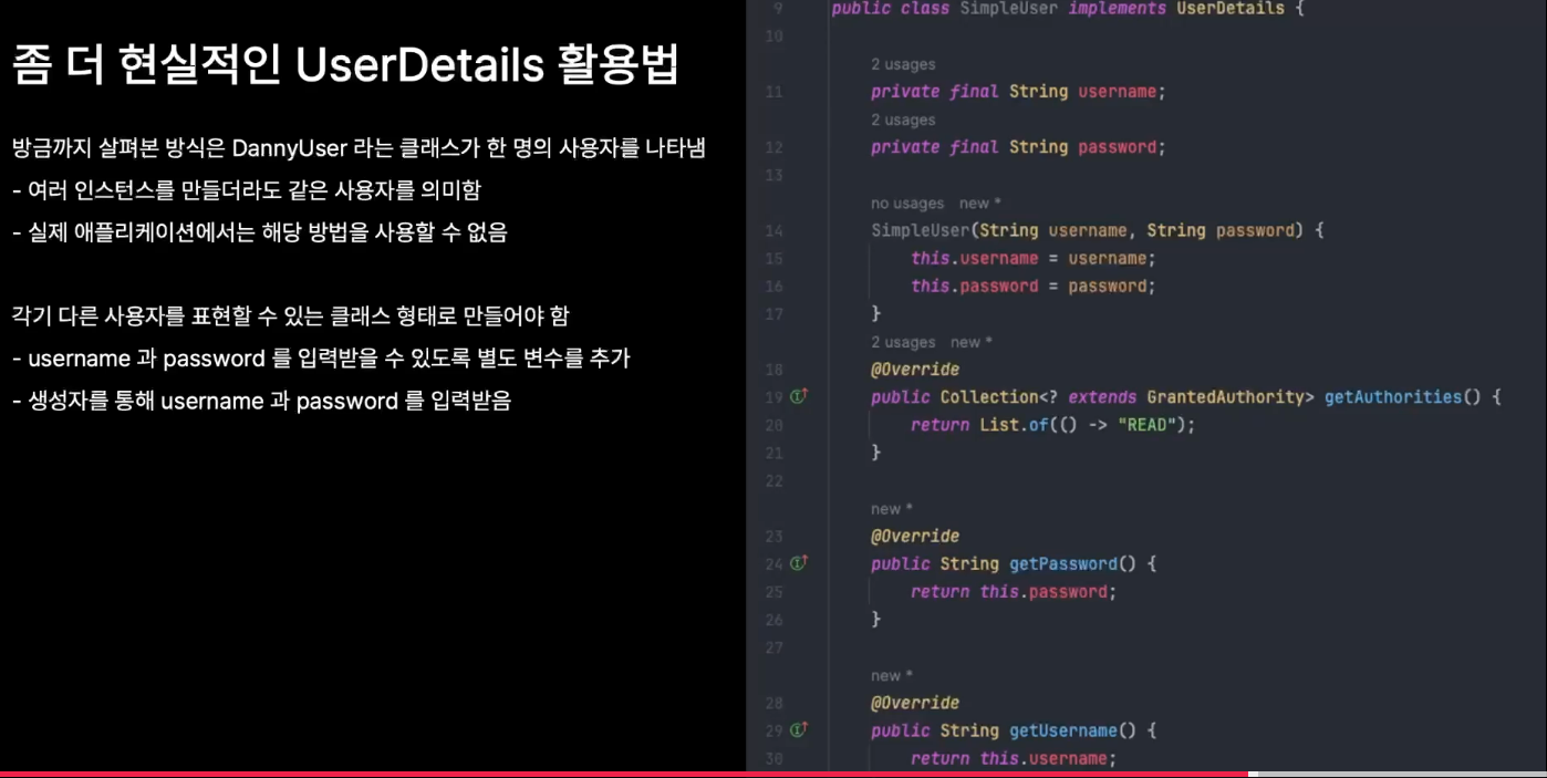 - 인터페이스이기 때문에 애플리케이션 수준에서 UserDetails를 구현해야 함.