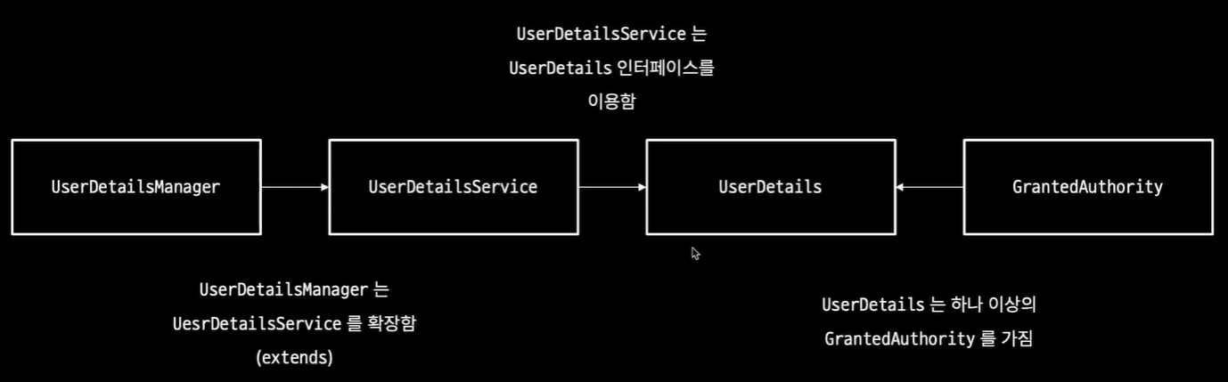 - UserDetailsManager는 사용자 추가, 수정, 삭제 작업을 수행함(Create, Update, Delete)
