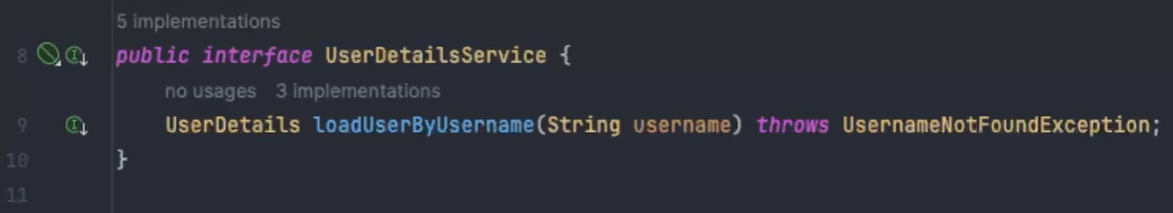 - UserDetailsService는 사용자 이름으로 조회한 사용자 세부 정보인 UserDetails를 반환함